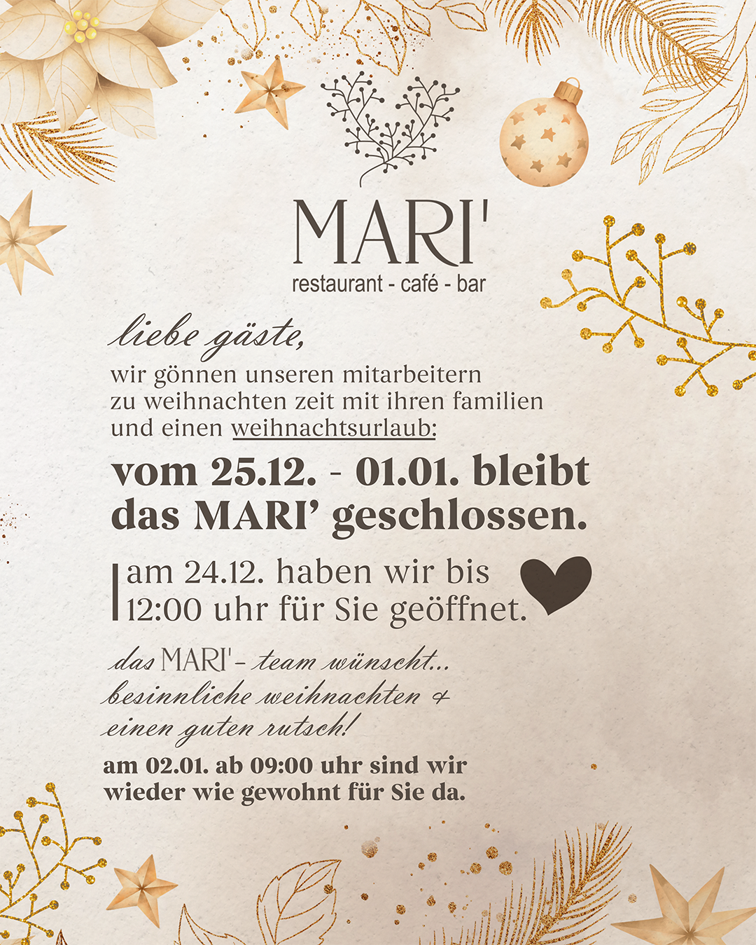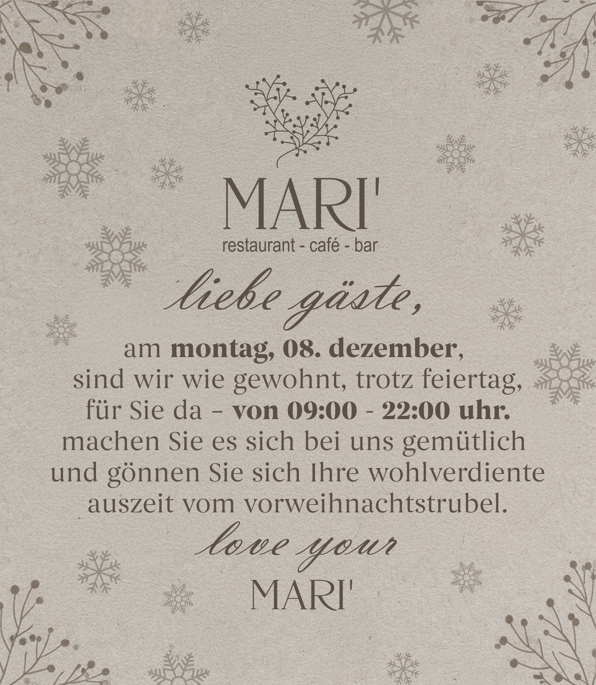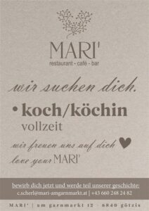 das MARI‘ ist perfekt für frühstücksliebhaber, die gerne energiegeladen in den tag starten. mittags bietet das mari‘ eine ideale location für geschäftsessen oder eine entspannte stärkung nach einem ausgiebigen einkaufsbummel. die abendstunden verwandeln das mari‘ in eine moderne bar, in der eine vielfältige auswahl an herzhaften speisen, erlesenen weinen und köstlichen cocktails angeboten wird.
